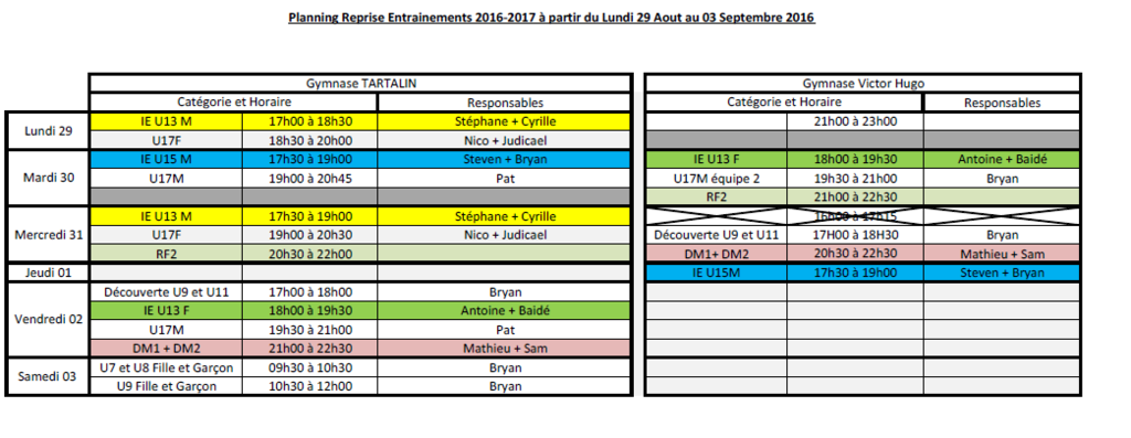 Planning entraînements IE-Niort